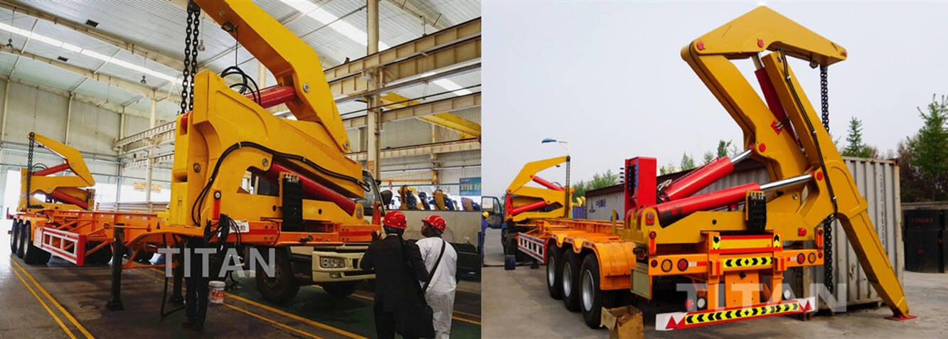 Container loader for sale is a self-loading trailer, typictrailer tank capacitytruck gasoline tankally skeletal, with two hydraulic lifting cranes to liftruck trailer flatbedsemi truck covert a container onto it. It can bestarting a semi truckdifferent types of semi trucks operated by the driver using controls on the side of the trailer or remote control.
